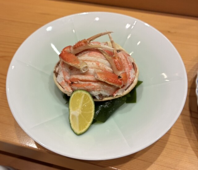 挨拶代わりに漬けマグロに始まり、まずは、香箱蟹、煮鮑、お刺身は、がす海老、ばい貝、寒ぶり。