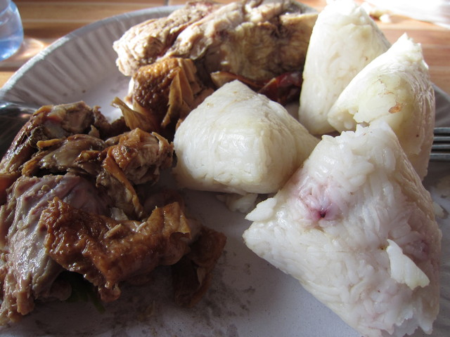 昼食:左手前から豚肉・鶏肉・ご飯