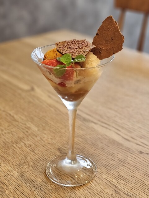 :キヤラメルショコラのムースとカカオパルプのソルベ