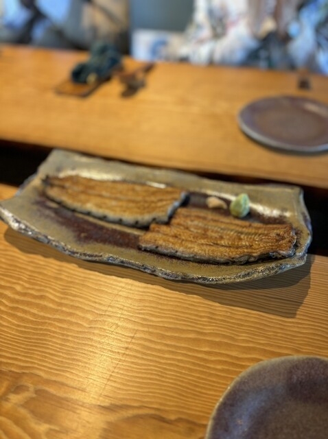 次に鰻白焼き。香ばしく、ミルで轢いた山椒をかけて頂きました。とても脂が乗っており、本当に美味しかったです!