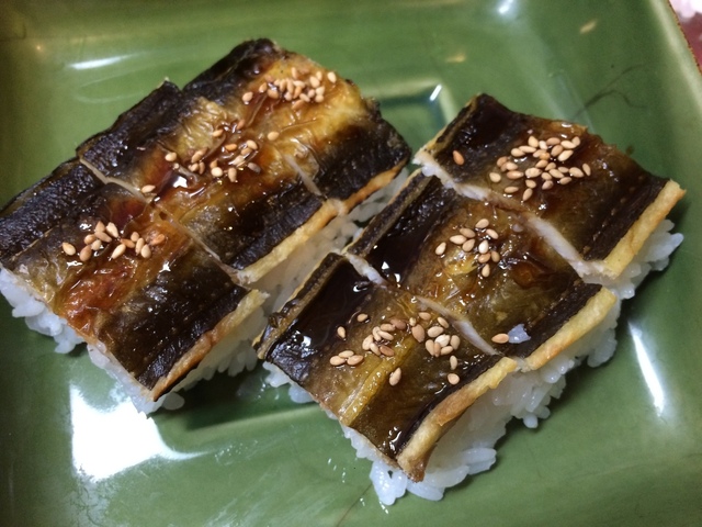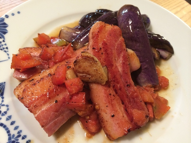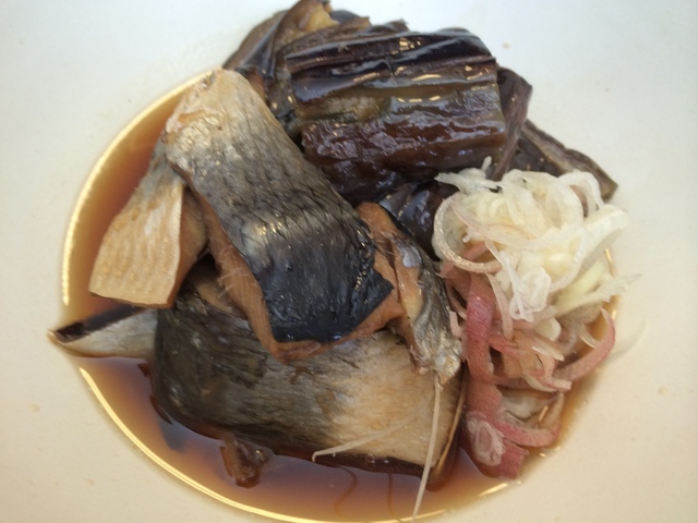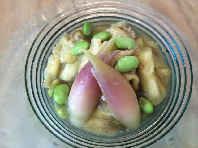焼き茄子の煮浸し。ミョウガと枝豆を添えました。