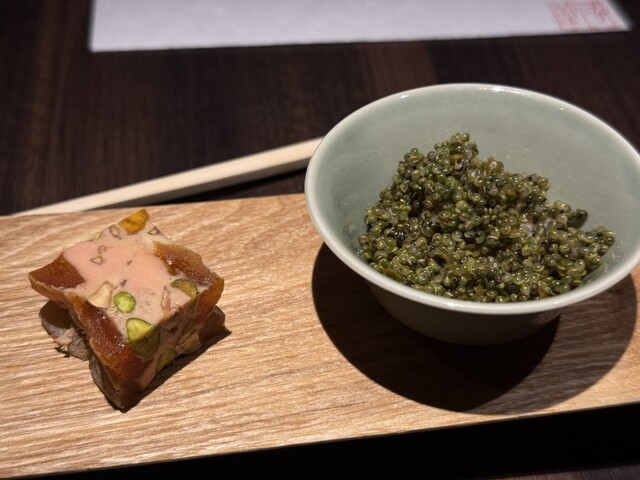 前菜のラインナップもなかなかのモノで、ウニとジュンサイの清涼感、自家製コンビーフサンドの背徳、グジェールのカリフワ感、生牛肉の柚子セビーチェのからみのキレ。前菜で既にフルコースを終えた気分になる。