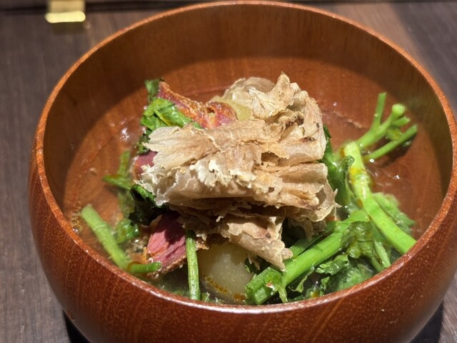 ハイライトのひとつは松茸キャビアご飯。そこにメゾンルロワのボーヌ1978を合わせる暴挙。震える美味さとはまさにこのこと。続くジュンサイとパプリカのアイスにはエシェゾー1978。ピークは過ぎているが、余韻に漂うグラン・クリュの威厳は失われていない。むしろ「老いてなお美しい」とはこのことか。