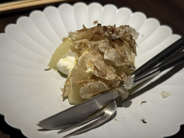 甘鯛のウロコ焼き、翡翠茄子と流れるように料理が続き、メインは岡崎牧場の長期肥育牛のカツレツ。脂の質感が見事で、シャトー・ラヤス ピニャン2006と噛み合って「北新地の夜はここに極まれり」と唸る。