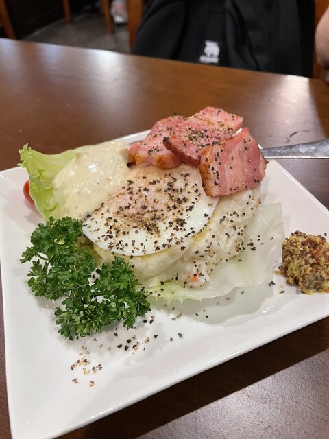 最強のポテトサラダは、厚切りベーコンと目玉焼きを混ぜていただきクリーミーでバランスも最強。