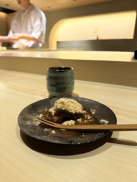 デザートの焼き葛餅、周りがパリッと香ばしくて、中はとろっととろけてこの食感がたまらない。