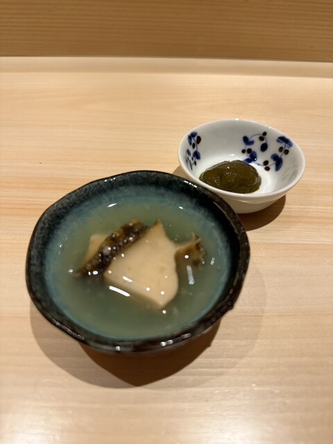 佐渡産鮑は、濃厚な旨味と苦味に磯の香り豊かなきもだれで頂き、残った昆布と鮑を煮たお出汁の中に酢飯をぽんと入れてくれて、きもだれをたっぷりかけて頂きました。