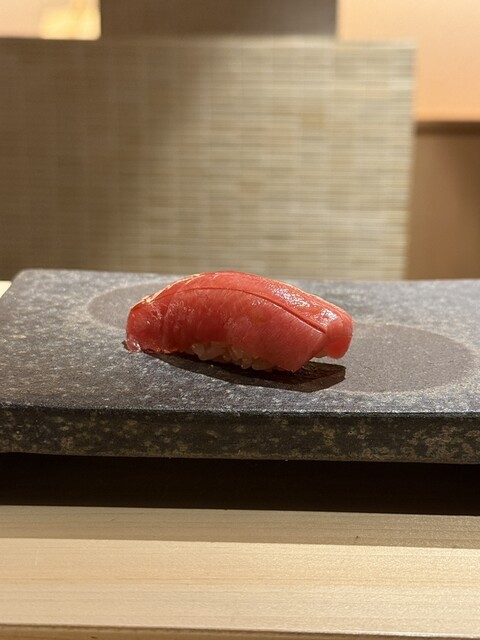 ネタに合わせた丁寧な仕事が施され、佐渡産メジマグロの皮目を炭火で炙ってサクッと香ばしく、身はきめ細かで柔らかくもっちりと美味。