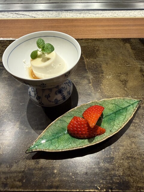 デザートは、素敵なロイヤルコペンハーゲンの器で供される自家製ゴマプリン。