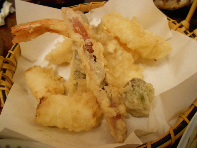 ある日の天ぷら定食の天ぷら(この日は、ふきのとう、長ネギ(甘い)、大根も)