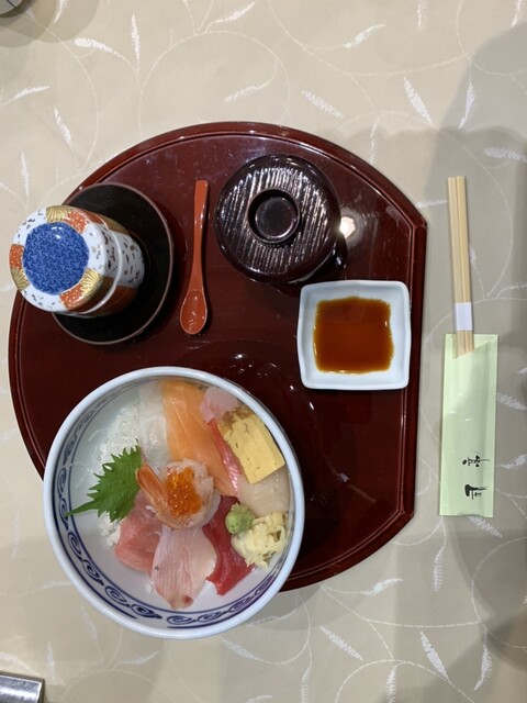 海鮮丼¥1500天丼¥1600税抜。どんぶりはご飯の量が選べる。茶碗蒸し、味噌汁、デザート付き。夜はサービス料10%。海鮮丼の刺身、茶碗蒸しとも美味しい。息子はいつも海鮮丼の大盛り。