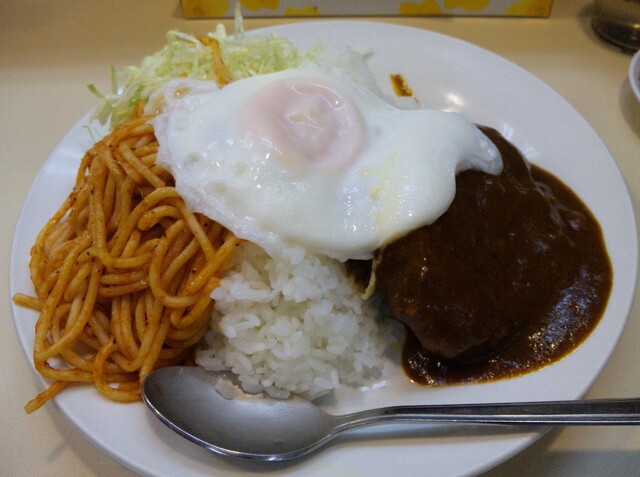 ナポリタン普通盛+ハンバーグ丼大盛WIHT目玉