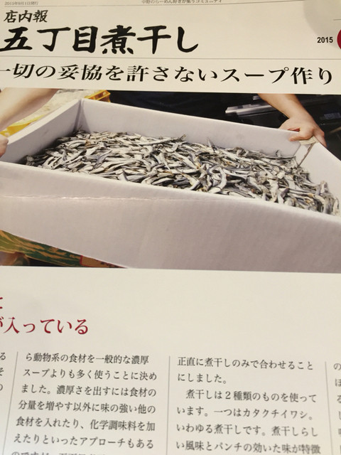 遅いランチになりました。中野は多くの飲食店があり悩みます。初めての入るお店と決めてさまようこと10分。こちらへ。煮干しエキスがたっぷり入っていて香りも良いです。麺も太めで好きな タイプのお店です。写真の品は全部のせです。チャーシューが大きくて厚みもあり食べ応えがあります。3枚も付いてきます。お腹一杯になって午後の仕事が心配です。店主は若き青年。スープ作りに5年を費やしたとのこと。煮干しの品の良いえぐみが良かったです。