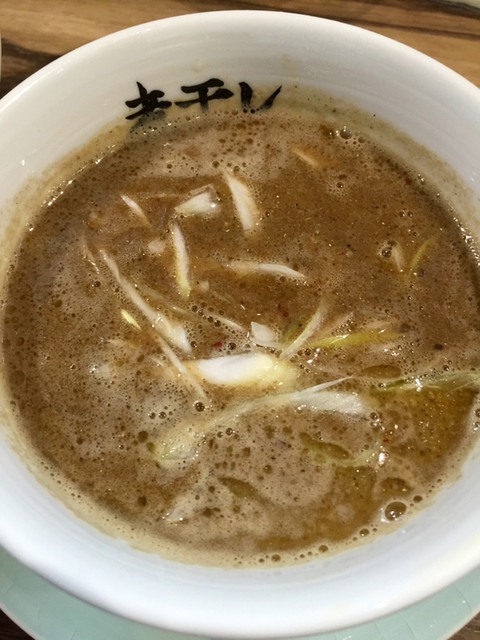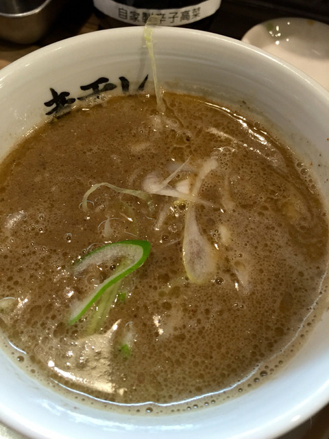 本日は伯母の葬儀のため午後は休みを取りました。何か食べて行こう思い、以前、立ち寄ったこちらへ。ワガママなものですから並ぶのは限られたお店だけにしているのですが、今日は意を決して並びました。就職活動中と思われる女性が4名同時に出られたので待ち時間は10分で済みました。ラッキーです。つけ麺全部のせのチケットを購入し、カウンターで待ちます。男性の方2名で作られていますが、色々な点に配慮しているのが見ていて嬉しく思いました。また、女性のお客様が一人で入店される頻度が高いのにも納得しました。良いお店だと思います。煮干しの良いところを凝縮して提供していると思います。