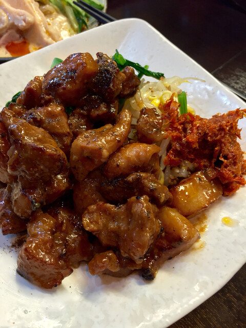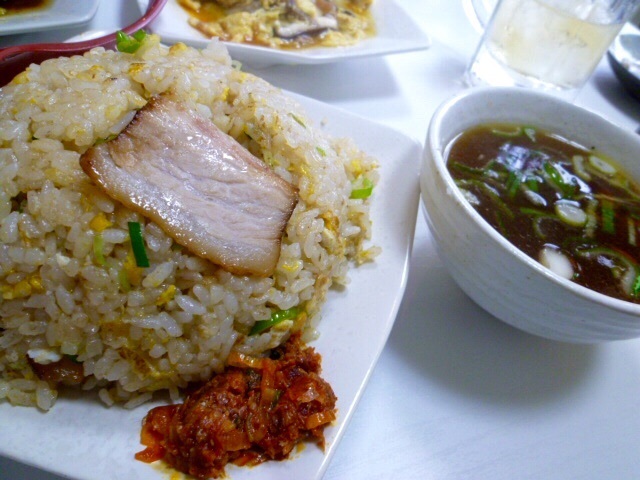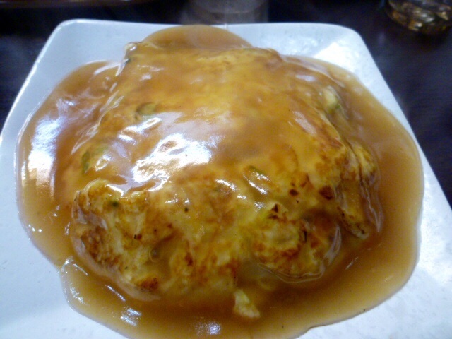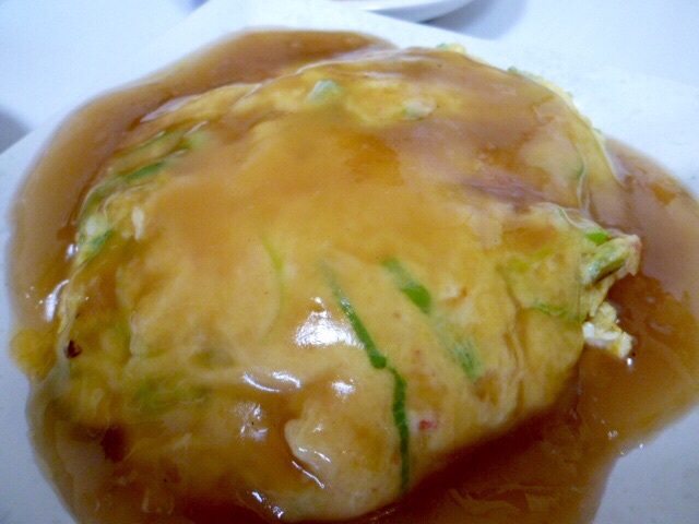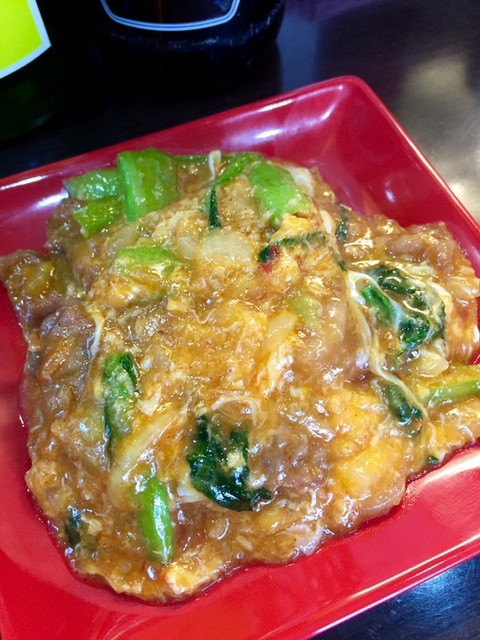 チャーシュー。ピータンで軽く飲み、お店が少し空いたところで、かに玉をお願いしました。ふくよかな香りと圧倒的なボリューム。