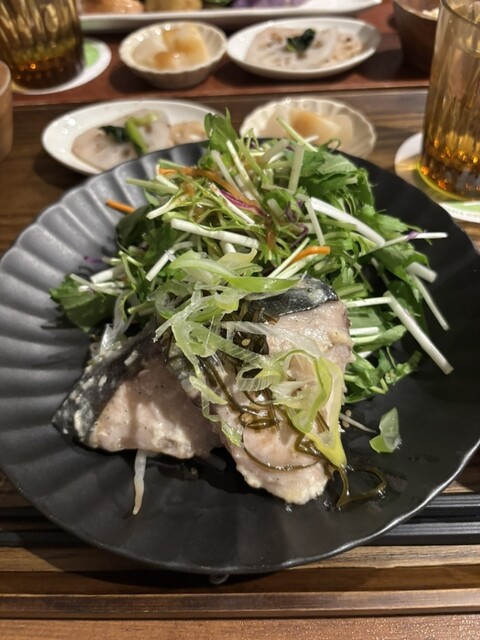 天然塩の胡麻塩、ポテトサラダ、梅味レンコン、ふろふきかぶ、お野菜しっかりお味噌汁、大きめの鰤が2切れに山盛りの野菜サラダ