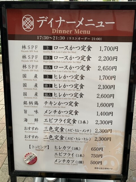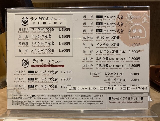 「ランチ限定のロースかつ定食1,450円とディナーメニューにある上ロースかつ定食1,700円、より、特上2,200円(180g)と極み2,700円(240g)は、リブロースなのでお勧めです。」