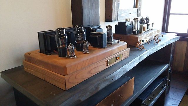 中に入ると右側に古木の大きな長テーブルがあり今では珍しい真空管のオー