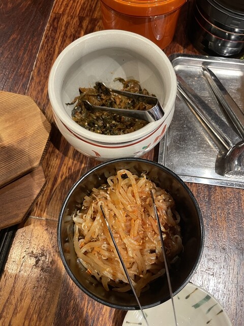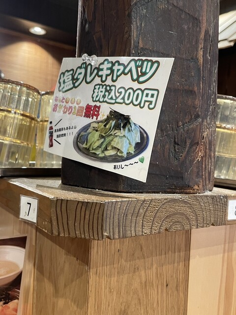 ラーメンを待っている間に、もやしと高菜をつまみます。おかわり一回無料の塩だれキャベツも気になるなぁ。