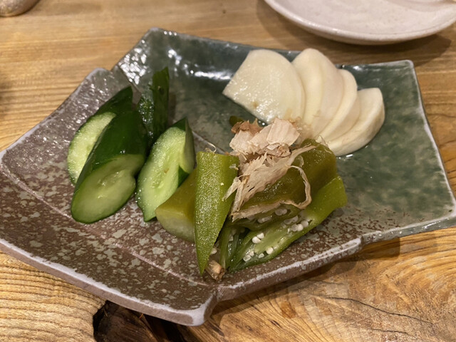 旬野菜のわさび漬け,炙り鶏皮ポン酢