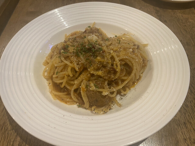 やってきたミートソーススパは本格的なボロネーゼでミートボールとも
