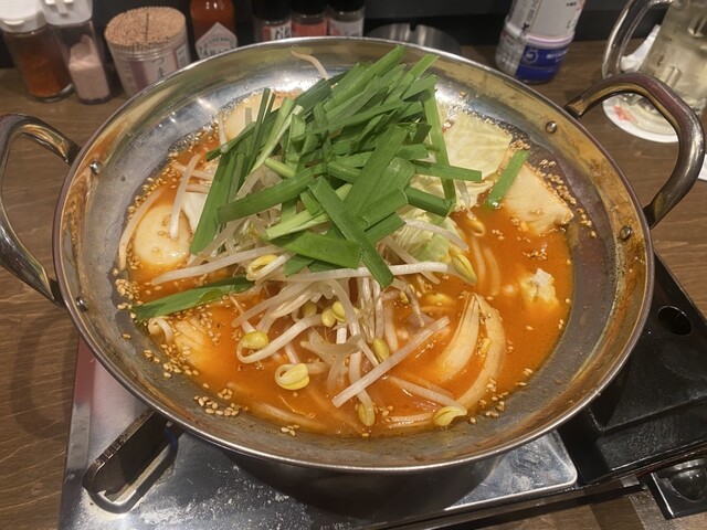 鍋にはチゲスープにホルモン,もやし,キャベツ,