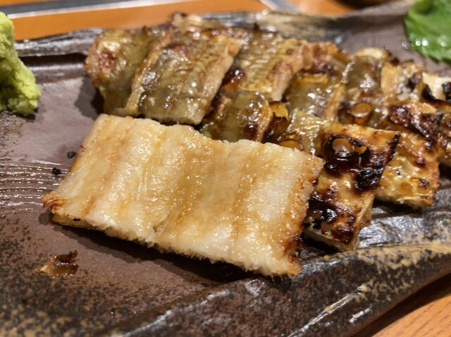 次は白焼き。なぜか皮面を上にして登場です。少し焦げがある程度の絶妙な焼き加減でパリパリ、内側は一切焦げ目がない黄金色。素晴らしい。穴子はあっさりしているので鰻よりも白焼きが合うような気がします。