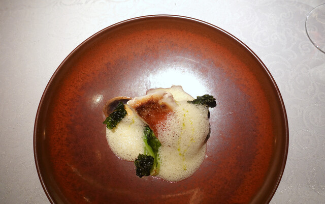 前菜のフォアグラのポワレは珍しい ’なかののきらめき’という長野
