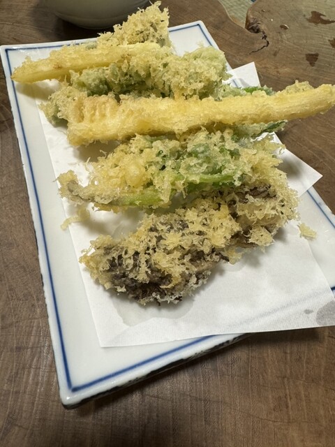 運ばれてきた大盛りは並の倍の量。うどんの上には椎茸と、おしんこ、ネギとさらに盛りだくさん。ざるうどん漬け汁は予想通りの醤油と、プラス150円でゴマダレも追加。天ぷらは山の中だから、やまうど、たけのこ、せり、あしたば、アスパラとあと一品山菜と舞茸。手作り刺身こんにゃくは、醤油で、山椒を散らしていただきます。