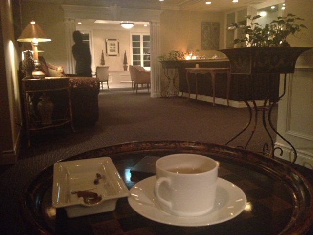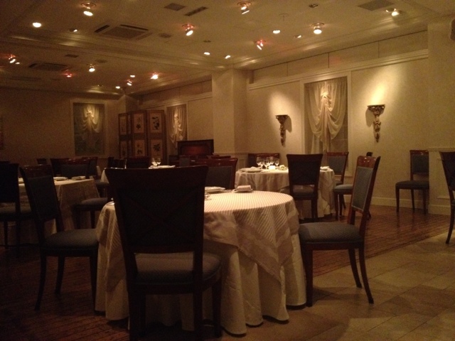 さて、レストランへ出かけてみると、敷地へ入るとすぐに案内係に声をかけられ、店内へ案内してくれます。コートを預けて準備ができると、メインフロアへ。お庭に面した席に案内されました。天井が高くて広いフロアで、テーブルとテーブルの間も十分な距離があり、心地よい空間で、この後の食事へ期待が高まります。