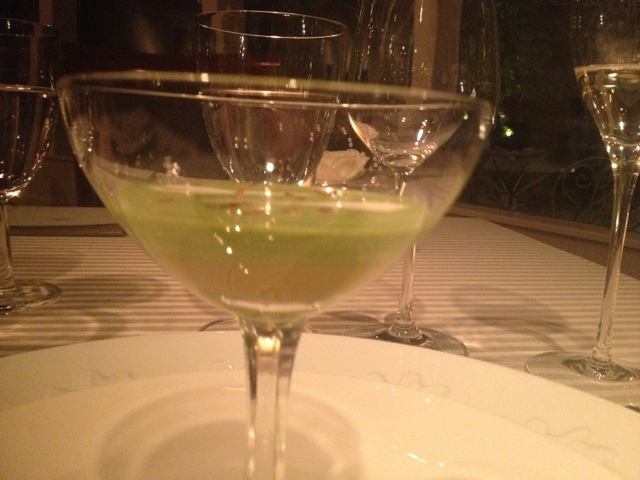 アミューズは、コンソメのジュレと青菜のムース。
