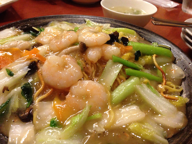 *牡蠣のオイスターソース炒め=牡蠣は片栗で衣つけて揚げてから炒め。