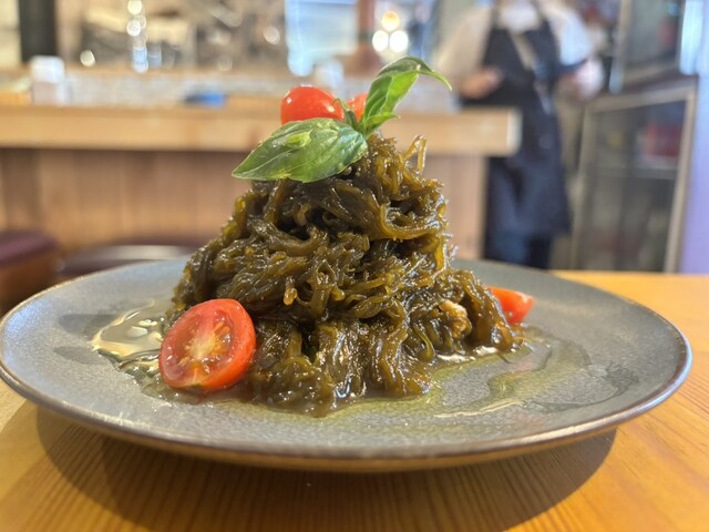 これ最初のイメージは、パスタのペペロンチーノの具材にモズクを混ぜたもの?と思っていた。