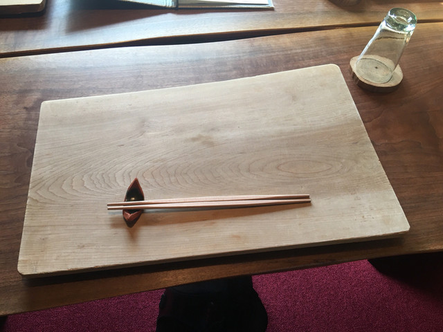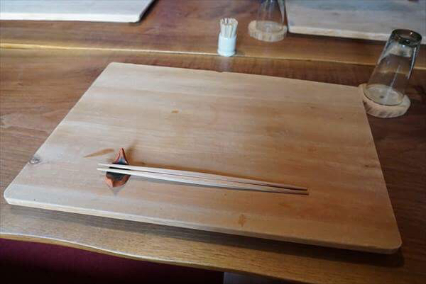 テーブルには、厚みのある板が置かれ、ランチョンがわりに。