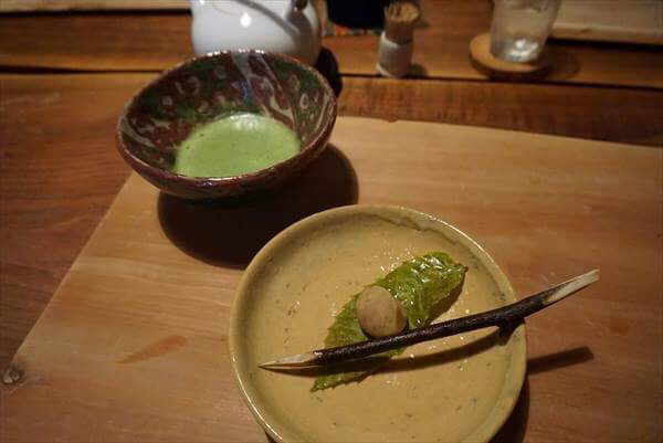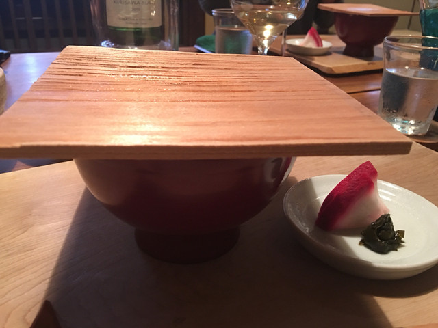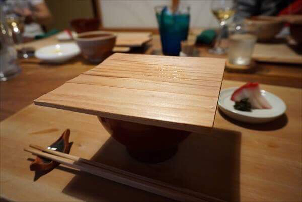 運ばれてきたときは、漆のおわんに一枚板で蓋がされて提供。