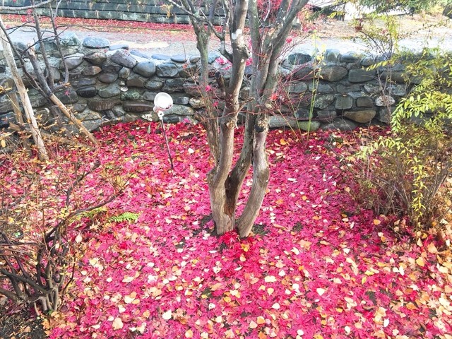 エントランス付近に、もみじの木、真っ赤に色づいた葉が地いり面に落ちて赤い絨毯のよう。