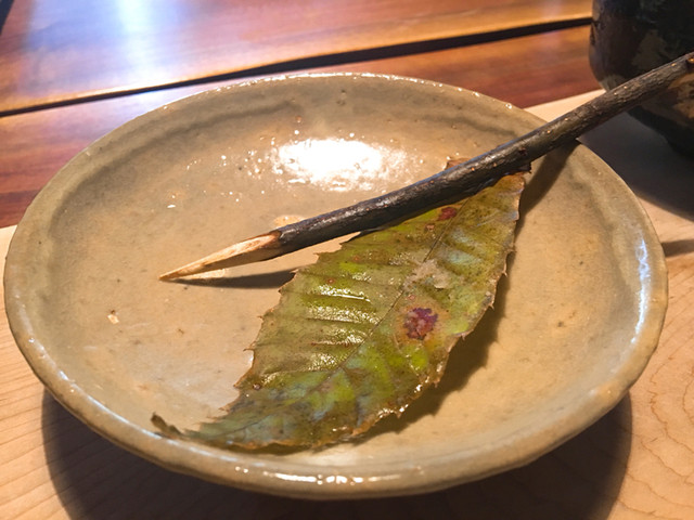 つまものの葉の上に乗せられてかわいいサイズ、そしてそれをいただくのはホンモノの枝。