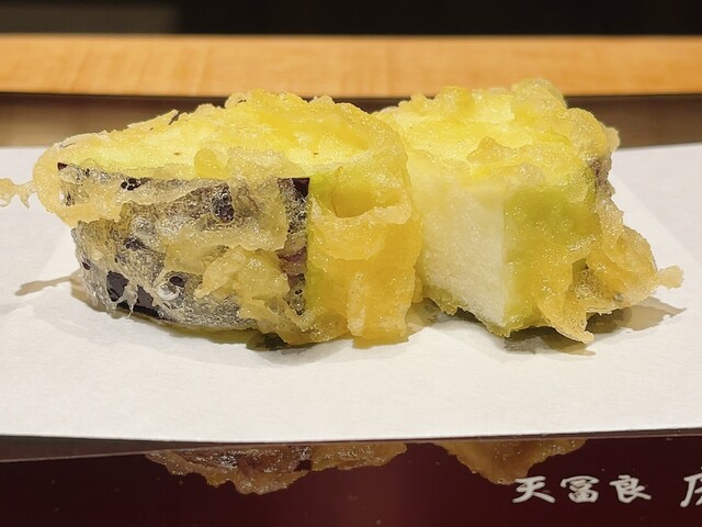 @熊本赤茄子=大きな熊本ナス。揚げたては熱々、みずみずしく美味い。