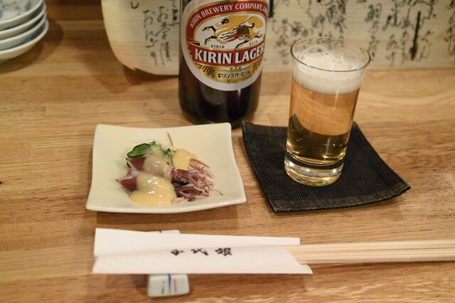 先ずはお通しと瓶ビールを頂きながら経木に書かれた達筆な献立を拝見しながら本日の流れを組み立てていきます。気になる料理がたくさんありましたが旬の鰆を塩焼きで頼みます。