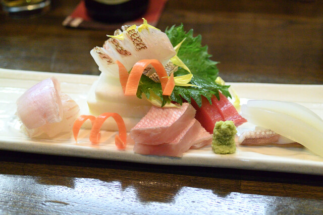 最初に選んだ料理は大納言さんの一番人気でもある刺身盛合せを頼みます。ボードに書かれた刺し盛りの内容は5種盛りでしたがサービスでスルメイカの鳴門巻きが付いていました。ひと手間掛けた刺身はどれも美味しくいつもながら豪華な内容に大満足でしたよ。