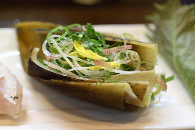 旬の食材を使った料理はどれも絶品でお酒が進みます。中でも生に近い状態で頂いた細いふきは日本酒との相性抜群でしたね。一品に対してお酒を一杯頂くスタイルで楽しみました。