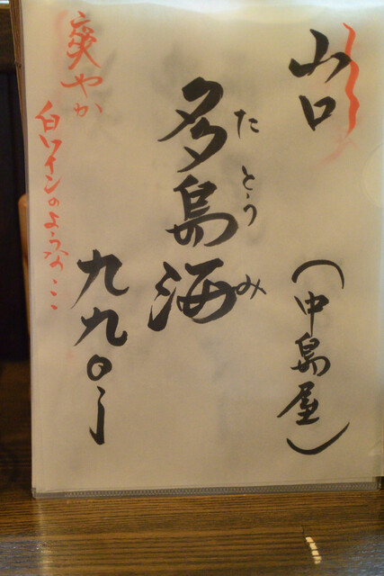 この日に頂いた最初の日本酒は「中島屋 秋上がり 純米無濾過原酒」です。秋の訪れが楽しめるラベルの冷酒は季節感を楽しめて良いですね。
