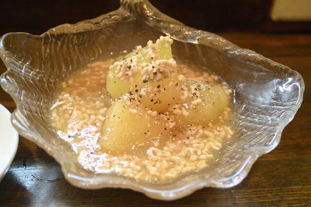野菜を使った温かい料理も食べたかったので冬瓜そぼろあんを頼みました。料理が提供される前に取り皿とレンゲが先に運ばれ察したとおり大きなガラスの器に盛り付けされた冬瓜そぼろあんが出てきました。これは2人でシェアしてもちょうど良い量でしたが水分の多い冬瓜は胃にも優しく気が付けばあっと言う間に食べ終わっていましたよ。