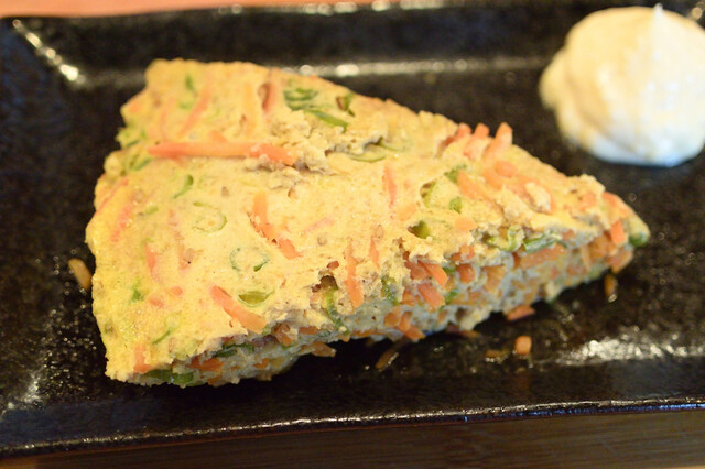 こちらはお通しがありませんのでスピードメニューでもあるおばんざいから気になる料理を選びます。最初に選んだ料理で「ツナと人参の中華オムレツ」はスペイン料理のトルティーヤをイメージして作られ具材もしっかりと入ってビールとの相性抜群でしたよ。