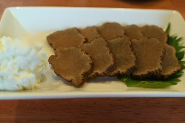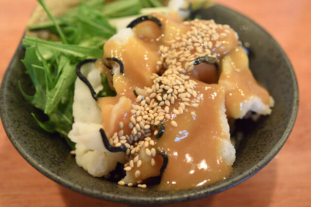 3品目はお店の看板料理でもあるクジラ料理の中からクジラの尾びれをスライスして酢味噌を和えた 「おばけ酢味噌和え」を頼みます。癖も無く歯応えを楽しめるこの一品で2合ほど飲めてしまったのでお店側にとっては儲からない料理かな。いつもは料理一品に対してお酒を一杯頼むスタイルで楽しみますがお酒が進む肴がばかりを頼んでしまい今回は一杯余分に飲んでいましたよ。