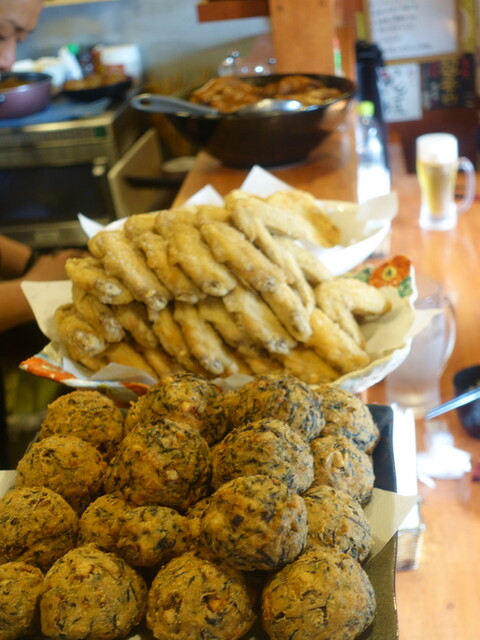 こちらのお店はお通しがありませんがカウンターに並ぶ大皿料理にはスピードメニューが沢山あります。手書きボードの本日のおすすめメニューには書かれていたいなかった「豚玉バーグ」があると聞き頼みましたが具材には旬の甘いキャベツと豚肉をふんだんに使った料理はお好み焼き感覚で頂ける料理でオリオンビールとの相性抜群でナイスな組み合わせでしたね。