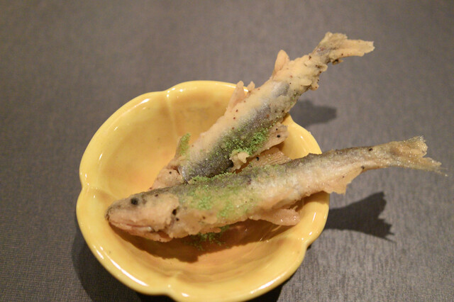 前菜だけで充分な内容でしたが板さんにおすすめの一品料理をお願いしましたらお品書きには記載されていない鮎を使った創作系の「鮎をチーズと海苔で巻いた香味揚げ」を出して下さいました。この料理はどんなお酒にも合い口の中では食材の旨味が調和され職人技の光る逸品に舌が唸りましたね。