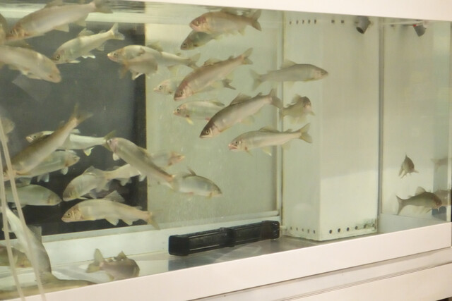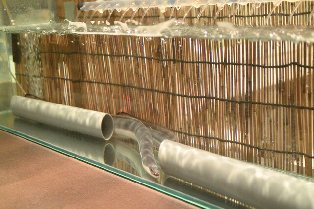 店内の水槽にはお造りや天ぷらなどに使われる鮎が元気よく泳いでいます