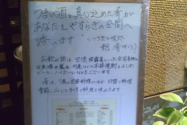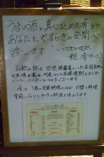 店名の「粗肴」とは「粗末な酒の肴」と言う意味ですが料理をいただけば店主の謙虚な姿勢がしっかりと伝わってきます。 ここは隠れ家的な存在の素敵な居酒屋ですよ♪
