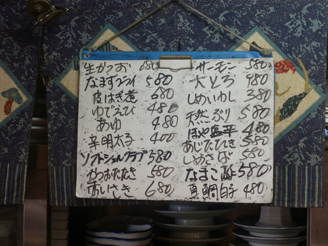 この日は相方とお昼に伺いカウンターでゆっくりと料理を楽しみました。壁に貼られたお品書きやボートには豊富な料理が記され、わくわくしてしまいますね。